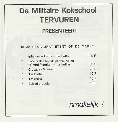 Eveneens uit het programmaboekje: 2 geflambeerde 'Grand Marnier'-pannekoeken + koffie voor 20 BF (0,5 €)